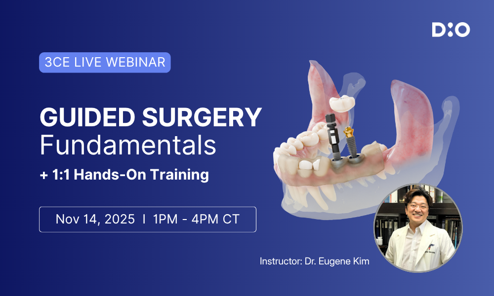 Join this focused online training to master the fundamentals of guided surgery using the DIO NAVI® digital workflow. Dr. Eugene Kim will cover the science behind guided implantology, walk through the digital workflow, and share real-world cases to simplify complex procedures. After the webinar, participants will receive a personalized 1:1 in-office hands-on session with their local DIO representative for practical training.
